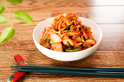 発酵食品であるキムチには、乳酸菌が多く含まれる他、 食物繊維やビタミンC、B2、B6 なども豊富に含まれます。 乳酸菌や食物繊維には、腸内の善玉菌を増やし、腸内 環境を整えるという重要な働きがあります。 腸には免疫機能の7割が集中し ているともいわれるので、 乳酸菌を含む食品を摂って腸を整えることは、 風 邪などを引きやすい時期には特に大切です。 ビタミンCやB群も免疫機能や、 体の基本的な機能に重要な成分です。 日本で流通している “キムチ” には、発酵せずにキムチ風の調味液に白菜 を浸した“キムチ風浅漬け”もあり、品質に幅がありますので、生産方法に も気を付けましょう。また、食事から摂取した乳酸菌は腸内には定着しない ので、毎日継続して食べるように心がけましょう。
